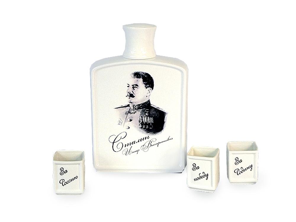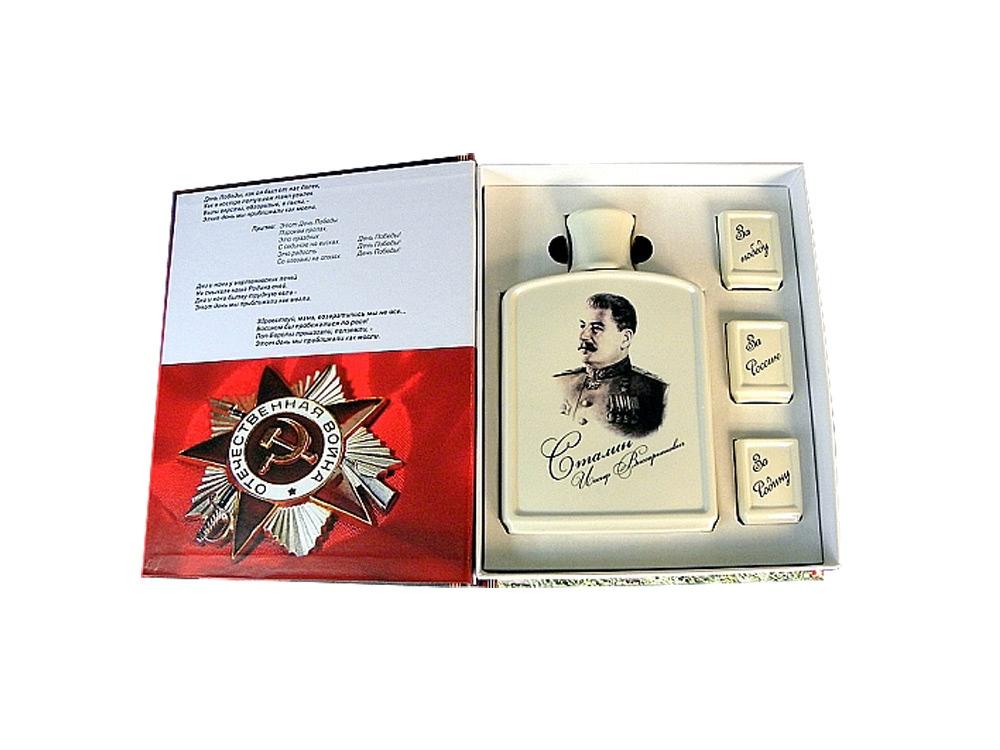 Подарочный набор стилизован под книгу и состоит из штофы с изображением генералиссимуса И. В. Сталина и трех рюмок с патриотическими тостами За Россию”, За Родину”, За победу”. Все сувениры выполнены из высококачественной керамики, поэтому они еще долго будут служить и радовать глаз. Этот подарочный набор станет прекрасным дополнением к праздничному столу.