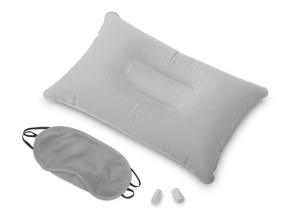 Путешествуйте с комфортом вместе с дорожным набором Cloud, который включает в себя подушку из ПВХ прямоугольной формы, повязку на глаза и полиуретановые беруши.